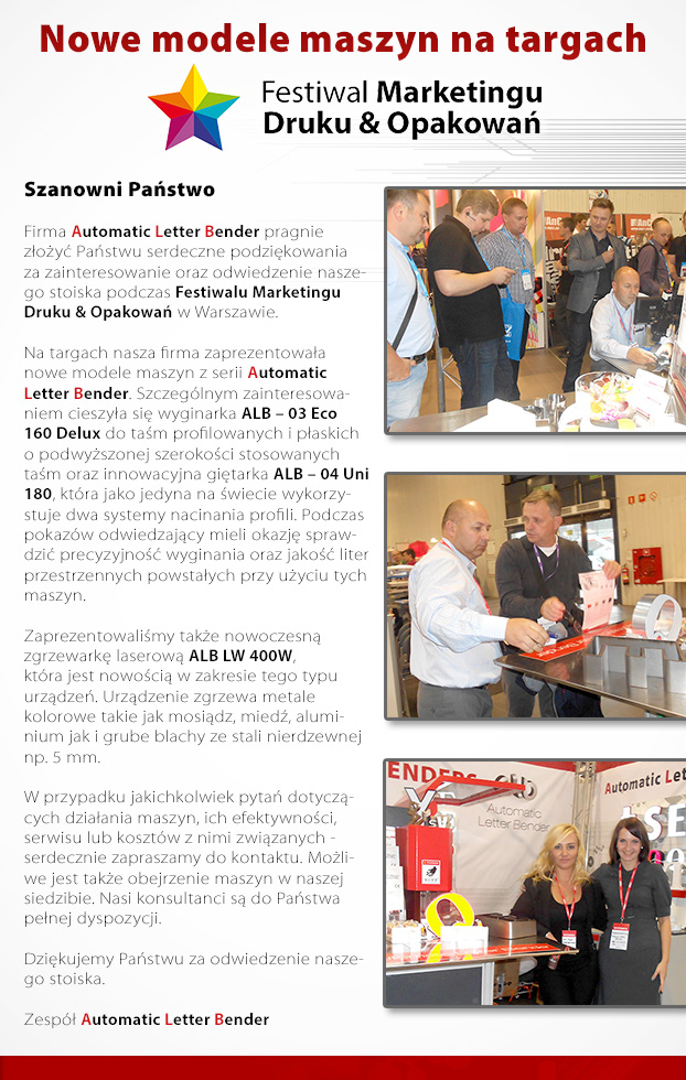 Firma Automatic Letter Bender składa serdeczne podziękowania wszystkim odwiedzającym nasze stoisko na "Festiwalu Marketingu Druku i Opakowań" w Warszawie.