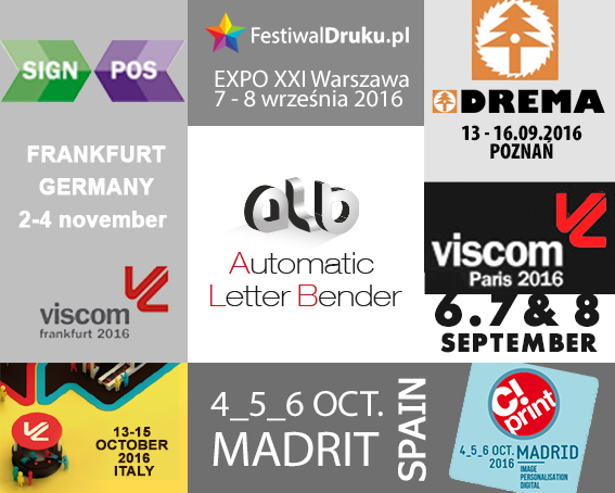 Marketing Festival - Warsaw (07-08.09.2016), Drema - Poznan (13-16.09.2016), Viscom - Paris (06-08.09.2016), C! Print - Madrid (04-06.10.2016) , Viscom - Milan (13-15.10.2016), Viscom - Frankfurt (02-04.10.2016)